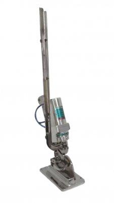 Máquina de grampear semi-automática construída em aço inoxidável e alumínio anodizado. Funcionamento através de ar comprimido e com sistema de acionamento no pedal para facilitar o manuseio do operador. Empregada para o fechamento de sacos industriais de polietileno, Embutidos e pacotes de Frango.